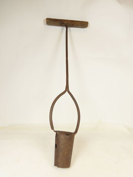 Metalen staaf met onderaan een cilindervormige holle bus en bovenaan een houten handgreep gebruikt voor het poten van aardappelen of bollen.