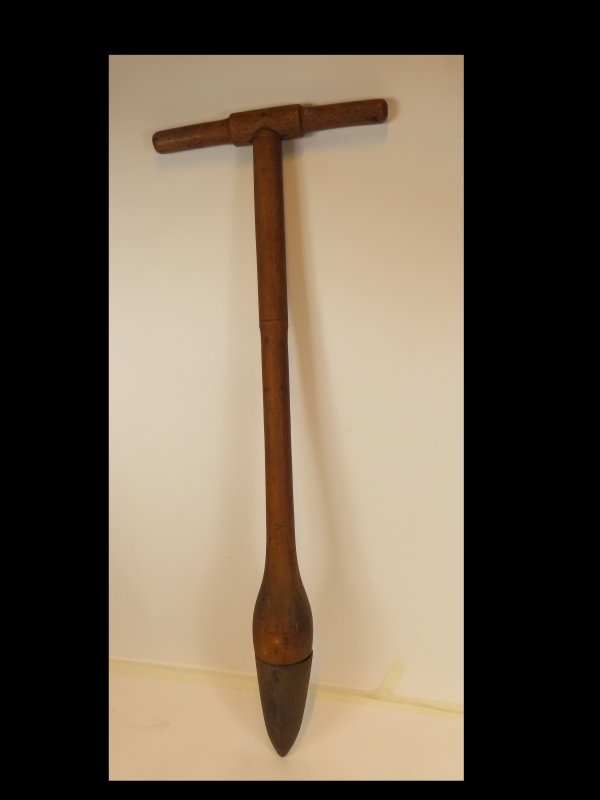 Houten steker met een metalen punt om gaten in de grond te maken. De metalen punt is op de 'neus' bevestigd met nagels.