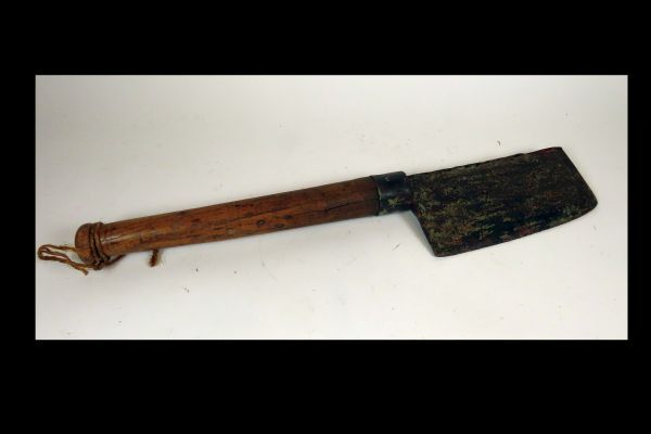 Zwaar metalen hakmes met houten steel. zoals o.m. gebruikt door de slager. De bevestiging van het mes in de steel is verstevigd met een 4.5 cm brede metalen ring. De houten steel loopt uit in een platte knop.