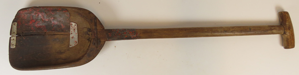 Donkere houten schep, zijnde een baggerschep waarvan het schepdeel en de steelaanzet is gerepareerd met diverse metalen strips.