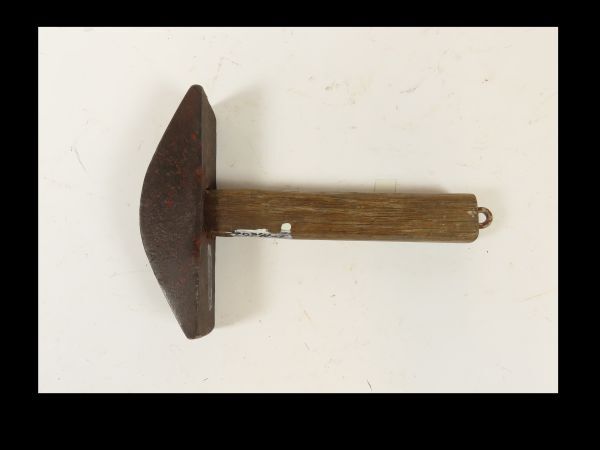 Metalen hamer met houten steel en ophangoog, bedoeld om een zeis mee te harden en scherpen(haren).