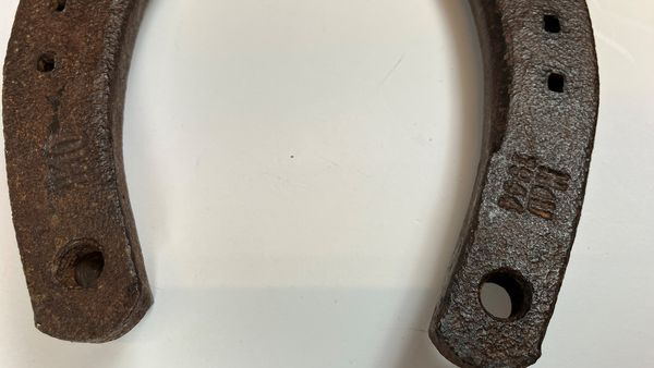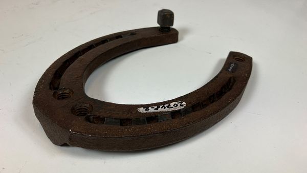 Hoefijzer met middenvoor een omgeslagen driehoekige punt, de zogeheten lip, gewoonlijk gebruikt voor het voorbeen van een paard. Aan de voorzijde en de beide uiteinden zijn ronde gaten aangebracht voor het plaatsen van hoefstiften (kalkoenen). In het rechter uiteinde is een hoefstift gedraaid.
