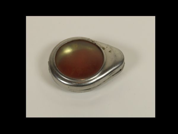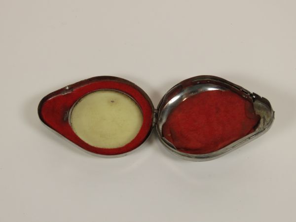 Zilverkleurige horlogedoos met venster,bedoeld voor opbergen horloge bij werken op het land, met roodkleurig binnenwerk.