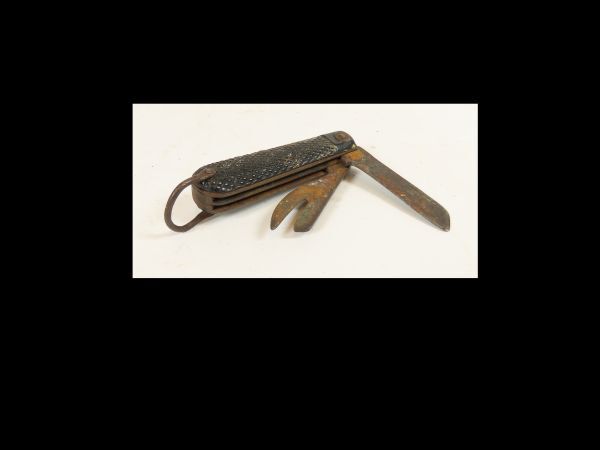 Metalen militair zakmes met een bakelite zijkant. Mogelijk gebruikt door een Engelse soldaat in WO2. Het mes heeft 2 bladen, nl. 1 mes en 1 fles/blikopener.