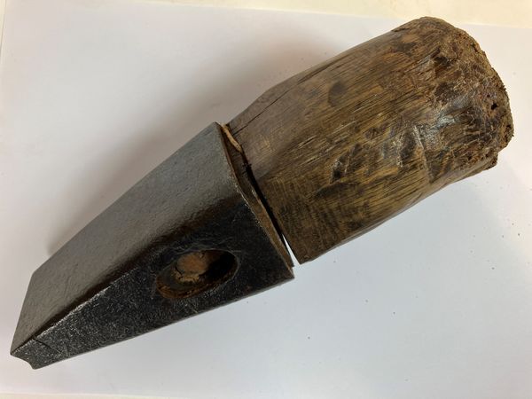 Holle, metalen 'hamerkop' met houten handvat. Zwaar slagwerktuig voor vastslaan van laatste band/hoepel van vat.