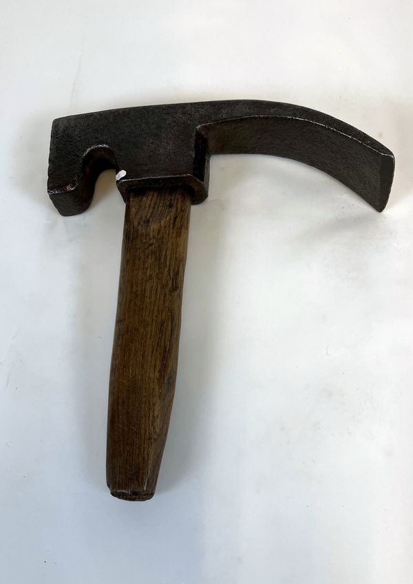 Dissel, zijnde hamer met houten steel van kuiper voor het maken van houten vaten. De platte kopkant is voozien van een ribbelpatroon.