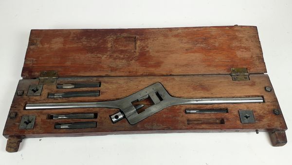 Bruin rechthoekig afsluitbaar houten kistje met aan de voorzijde twee dunne koperen sluithaakjes. Aan beide korte zijden is als steun een houten dwarsligger aangebracht die met twee bouten en moeren aan de bodem is bevestigd.. Het deksel kan m.b.v. twee koperen scharnieren worden geopend. In het kistje bevinden zich in daarvoor aangebrachte uitsparingen een wringijzer, ...