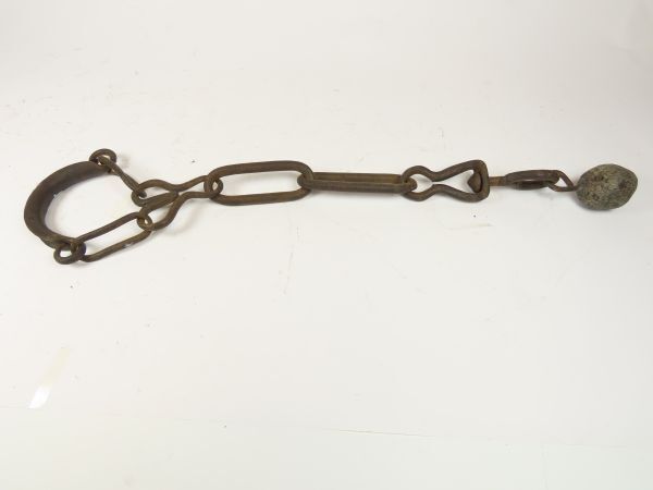 Metalen gesmede ketting met aan 1 uiteinde een metalen bal en aan het andere uiteinde een een half-cirkelvormig metalen stuk dat geborgd is met een bladveer, zijnde een pootkluister bedoeld om het hardlopen van het paard te voorkomen.