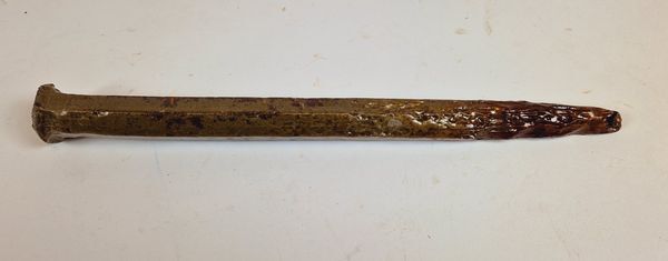 Gesmede 6 kantige nagel, waarvan de punt is omgebogen. De nagel is met een "vernis" bewerkt