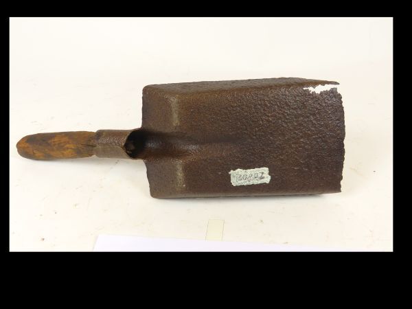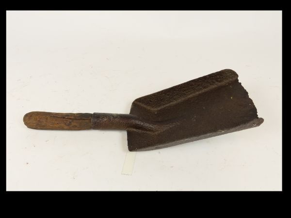 Schep, kolenschep met hardhouten steel en plat metalen schepblad dat aan de randen door oxydatie en gebruik afgesleten is.
