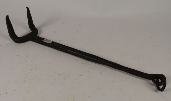 Stuk ijzer waarvan de vierkante steel naar boven toe overgaat in een ronde vorm die aan het einde is omgeslagen tot oog. Door het oog is een ring aangebracht. Aan de onderzijde is een u-vormig stuk ijzer aangesmeed, dat na circa 3 cm haaks is omgeslagen. De uiteinden eindigen in een punt (onderlinge afstand 7 ...