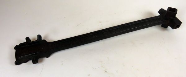 Grote metalen sleutel met aan de uiteinden hulpstukken voor het openen/dichten van allerlei soorten metalen vaten.