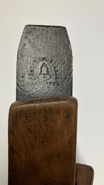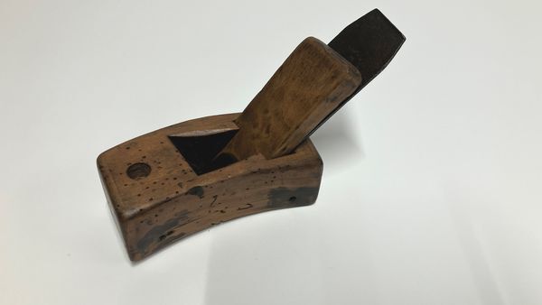Rondvormige houten schaaf, zijnde een blokschaaf. Op de beitelklem is tekst en een afbeelding van een klok zichtbaar.