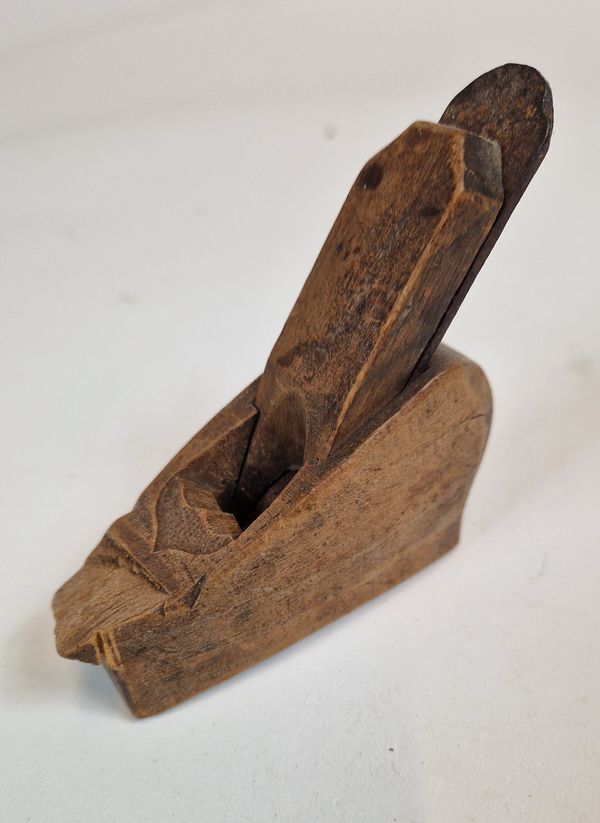 Houten schaaf, zijnde een gerfschaaf met holle beitel en een in de dwarsrichting ronde zool. De 'krul' aan de voorzijde is afgebroken