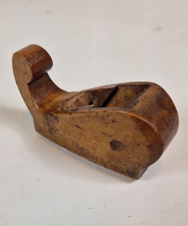 Houten schaaf, zijnde een gerfschaaf met een in de dwarsrichting bolle zool. Het mes ontbreekt.