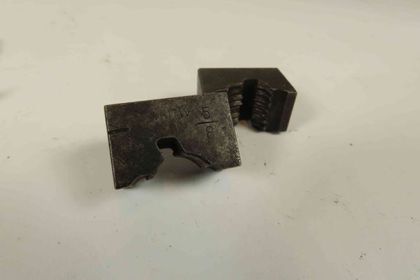Uit twee delen bestaand gehard stalen blokje met een van schroefdraad voorzien gat, waarmee men uitwendige schroefdraad kan snijden.