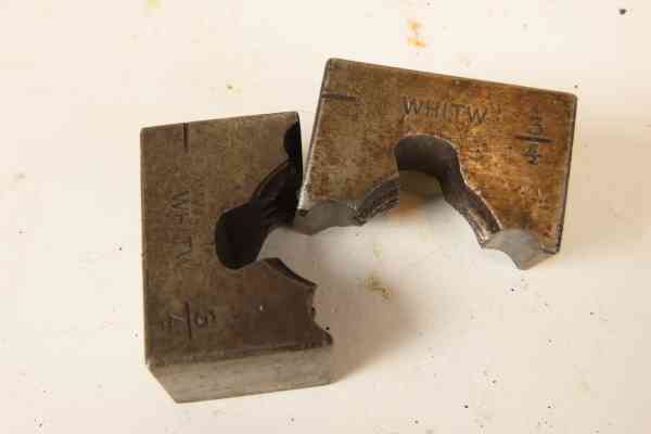 Uit twee delen bestaand gehard stalen blokje met een van schroefdraad voorzien gat, waarmee men uitwendige schroefdraad kan snijden.