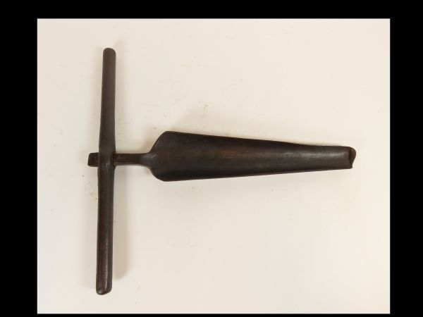 Gootvormig en taps toelopend metalen stuk gereedschap met los bevestigde metalen dwarsgreep. Het betreft hier een lepelboor, ook wel aangeduid als naafboor, bussenboor of schulpboor zoals gebruikt in de wagenmakerij.