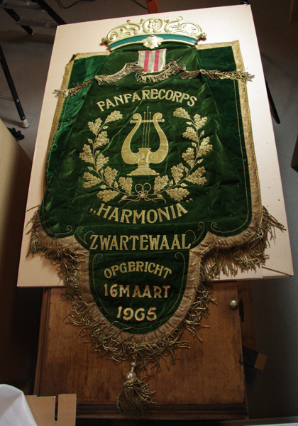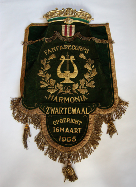 Donkergroen vaandel met franje van fanfarecorps Harmonia. In het midden een afbeelding van een luit met daaromheen een krans van eikenbladeren. Bovenaan een uit hout gesneden kroon en het wapen van Zwartewaal.