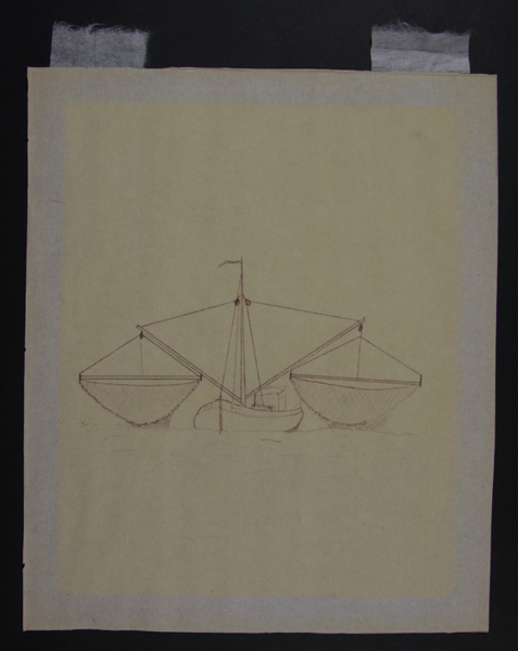 Tekening van vissersschip met opgehaalde sleepnetten aan beide zijden.