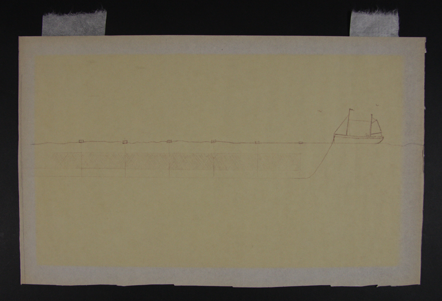 Tekening van uitgezet visnet, mogelijk een haringvleet. Rechts een vissersbootje.