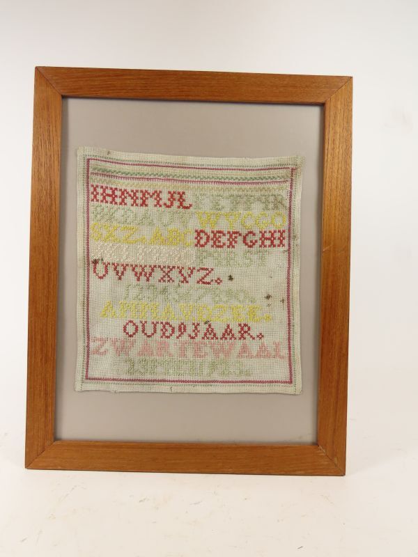 Ingelijst merklap vervaardigd door Anna van der Zee uit Zwartewaal. Op merklap diverse geborduurde (kruissteek) opschriften in de kleuren rood, groen, geel en roze. Merklap in houten lijst op licht grijze achtergrond.