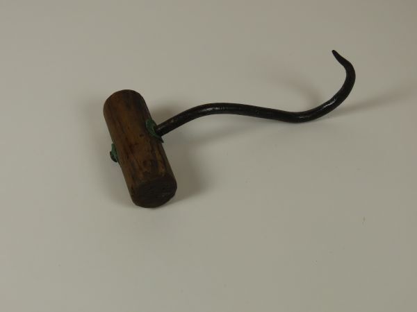 Gedeeltelijk rond gebogen ijzeren haak uitlopend in scherpe punt voor het laden en lossen van stro- en hooibalen. Het handvat is haaks op de haak gemonteerd. De haak is door het handvat vastgezet met twee sluitplaatjes.