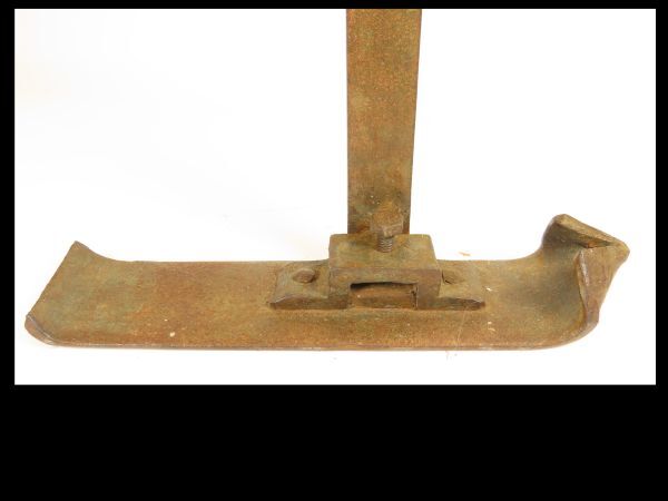 IJzeren plaat (voet) waarvan aan de voorzijde de hoeken naar binnen/achteren zijn geslagen. Aan de achterzijde is de plaat licht omhoog gebogen. Op de voet is een beugel met klemschroef aangebracht, waarin haaks op de voet een lange ijzeren staaf met 30 vertandingen is gemonteerd. M.b.v. de vertandingen kan de greppelploeg in hoogte worden versteld.