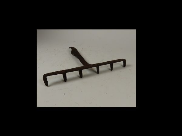 Metalen hark met 6 korte tanden van circa 35 mm zonder steel. Mogelijk gebruikt voor het trekken van zaaivoren (tuinbouw).