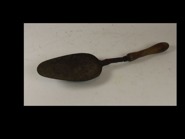 Eivormige holle schep met korte steel en houten handvat. Vermoedelijk een kolenschep.