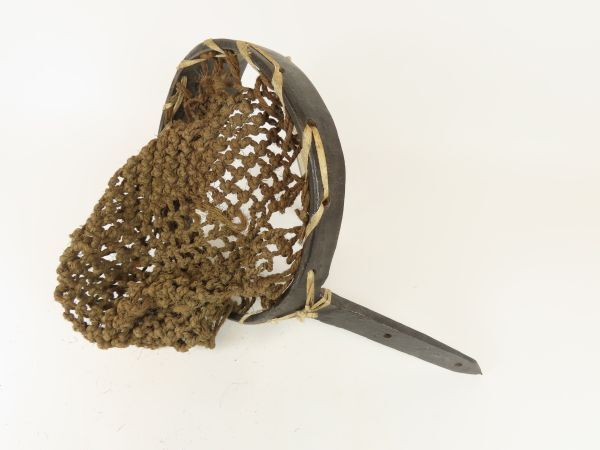 Ovaalvormige baggerbeugel met metalen punt waaraan een steel kan worden bevestigd en voorzien van net van hennep. Gebruikt voor het verwijderen van veendrek en andere troep uit waterlopen.