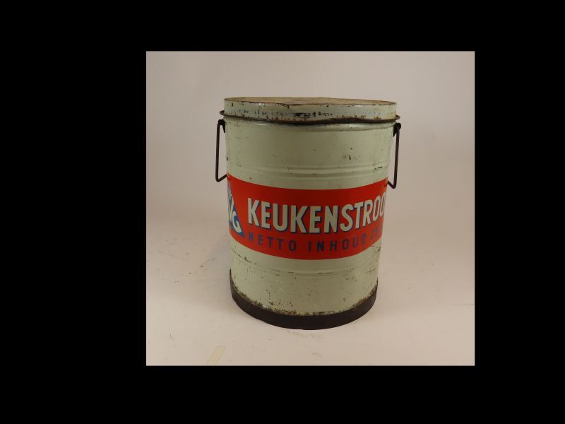 Groot blik met deksel en twee handgrepen. Het blik heeft een nettoinhoud van 25 kg. Het is wit geschilderd met een brede horizontale rode band, waarop vermeld Keukenstroop (voorzijde) en COPRO (achterzijde)