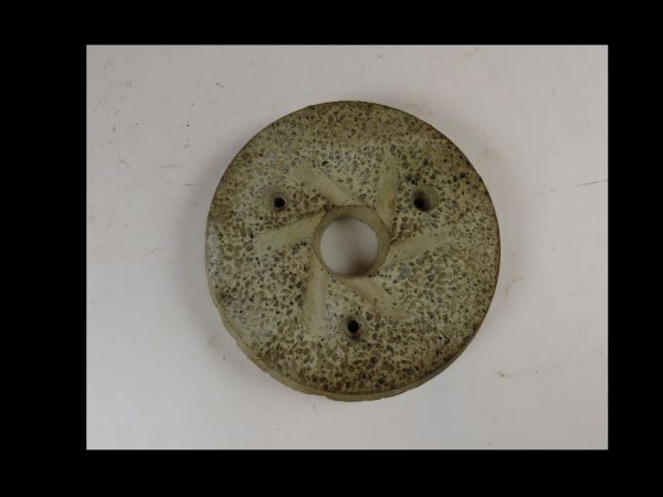 Maalsteen, voorzien van drie schroefgaten. In het midden een taps toelopend gat en aan bovenzijde 6 groeven van het midden naar de rand.