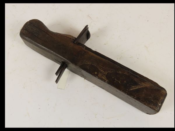 Houten blok met schaaf van een kuiper voor het uitschaven ofwel krozen van de groef ofwel kroos ofwel kroosgroeve waarin de bodem van een ton sluit. Het platte schaafblad heeft vijf tanden en is met een metalen spie in het blok geklemd. Het blok wordt voor gebruik met een wig vastgezet in een houten 'halvemaanvormig' ...