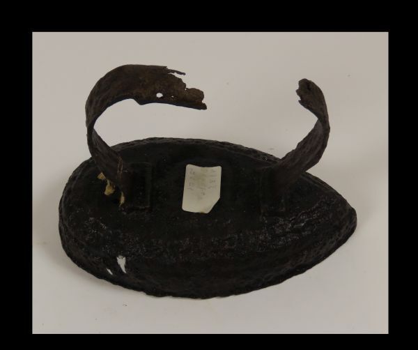 Strijkijzer, druppelvormig met opstaand beugelhandvat welke bovenaan deels wegggeroest is.