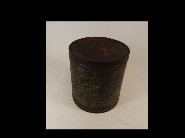 Groot blik met oversluitend deksel. Product- en productie-informatie ontbreekt. Binnenin twee bruine bonen.