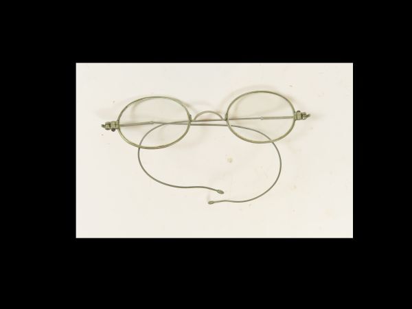 Bril met ovalen glazen, zilverkleurig montuur met halfronde, geveerde poten. De bril bevond zich in de Sigarendroogtrommel, Z2091.