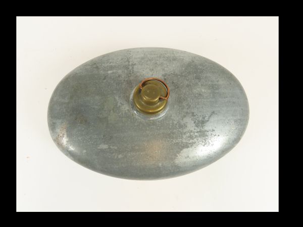 Kruik, zijnde een warmwaterkruik om het bed te verwarmen en warm te houden. Zilverkleurig metaal met koperen sluitdop en ring. Kruik bevindt zich in de Sigarendroogtrommel Z2091.