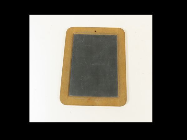 Leistenen schrijfplak met houten rand. In bovenste rand een gaatje. Leitje bevond zich in de sigarendroogtrommel, zaaknr. Z2091.