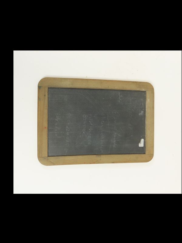 Leistenen schrijfplankje met houten rand. Achterzijde bekrast, voorzijde beschreven (onleesbaar), beide niet te verwijderen.