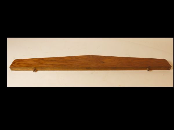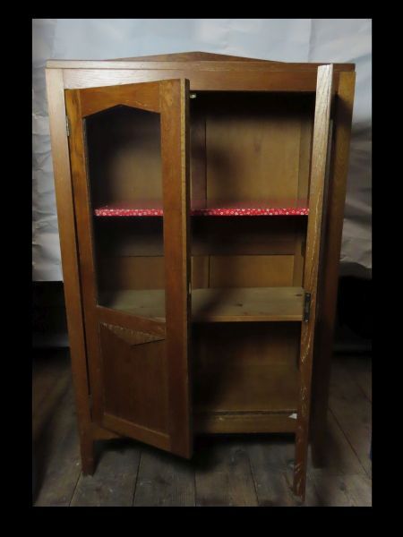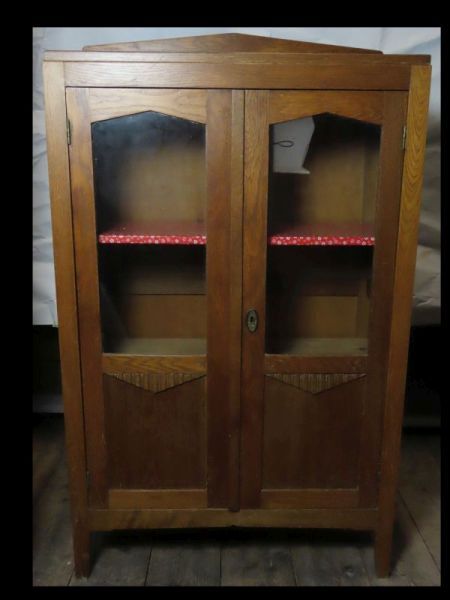 Afsluitbare vitrinekast met twee losse legplanken. Bovenste plank bekleedt met rood/wit papier. Deuren gedeeltelijk met glas. Losse sierrand voor bovenzijde. Mogelijk gebruikt als servieskast.