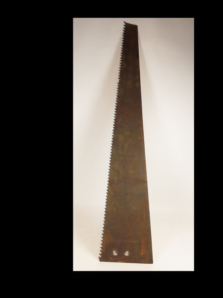 Grote, grof getande zaag. Twee gaten tbv bevestiging handgreep. Handgreep ontbreekt.