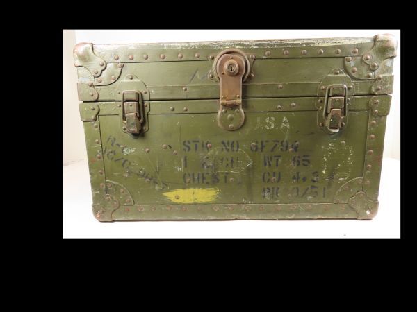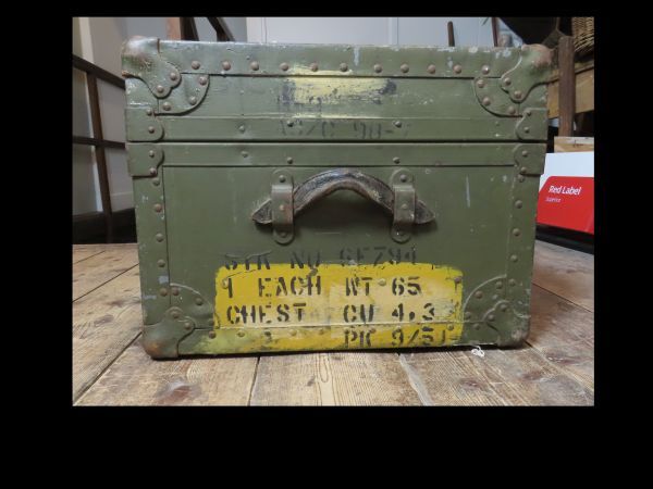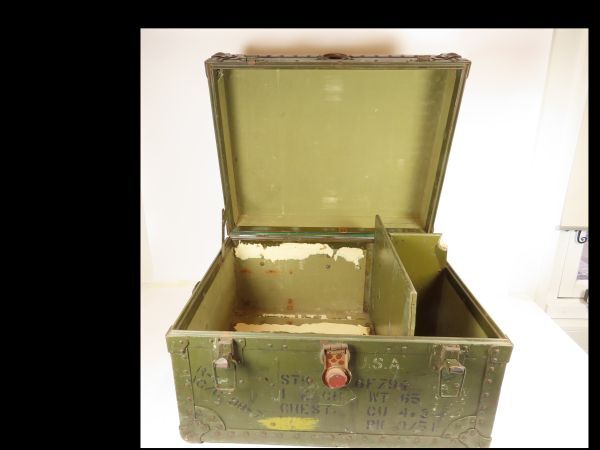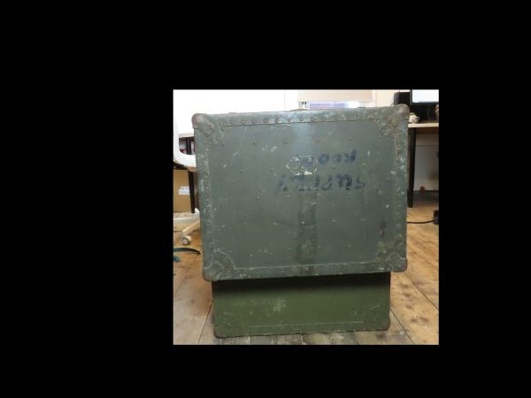 Groene metalen voorrraadkist, van binnen bekleed met textiel en verdeeld in drie vakken (groot naar klein). Voorzijde, bovenzijde en zijkant - links gesjabloneerd met zwarte letters en cijfers. aan de zijkanten tee lederen handgrepen.
