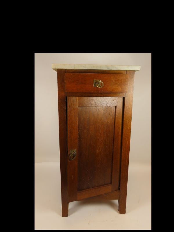 Houten kastje, voorzien van een wit marmeren bovenblad en een scharnierend deurtje. Het kastje heeft een laatje en twee verdiepingen. Metalen ringen als greep om deurtje en laatje te open en/of sluiten.