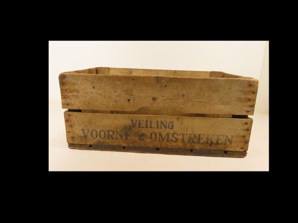 Houten, rechthoekige kist, twee planken rondom, 6 planken onderzijde. In zwarte letter : Veiling VOORNE & OMSTREKEN.