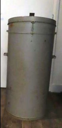 Metalen stembus, grijs geschilderd. De stembus heeft een met een hangslot (niet aanwezig) af te sluiten deksel welke is voorzien een gleuf voor het stembiljet en handgreep aan de scharnierzijde. Twee handgrepen aan zijkanten.