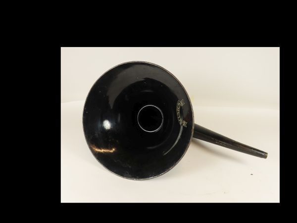 Metalen hoorn van een grammofoon. De hoorn is zwart gelakt.