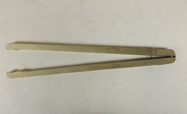 Knijphout, behorend bij een wasketel. Het knijphout heeft in elkaar passende rondingen aan het grijpgedeelte, een metalen veerstrookje aan de achterzijde en wordt eveneens aan achterzijde bijeengehpuden door een metalen draad.