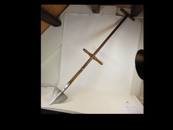 Metalen driehoekige spade met houten steel en handgreep voor het afsteken van hoge slootkanten. De handgreep is extra verstevigd vastgezet aan steel met een metalen plaatje. De spade is verlengd met houten steel en greep, vastgezet met twee metalen bouten en moeren. Blasd loopt uit in een punt.