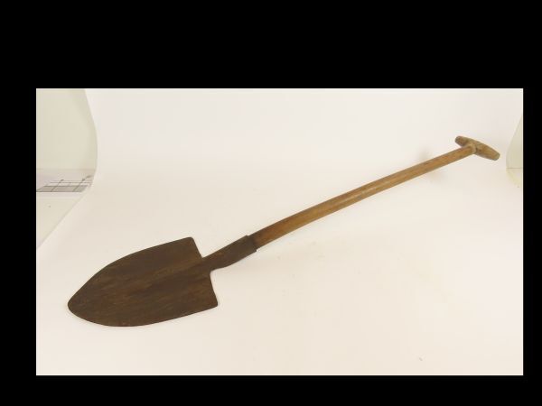 Metalen platte spade met houten steel en handgreep. Blad loopt uit in een punt.